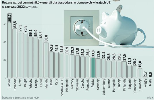 W krajach UE nośniki energii dla gospodarstw domowych w czerwcu tego roku były średnio aż o 41,8 proc. droższe niż rok wcześniej – wynika z danych Eurostatu na temat inflacji konsumenckiej (HICP). W czterech krajach ceny skoczyły o ponad 75 proc. (Belgia, Litwa, Holandia, Estończycy zaś muszą płacić za energię nawet dwa razy więcej niż rok wcześniej). Dla porównania, w Polsce wzrost cen w tej kategorii wyniósł „skromne” 33,8 proc.