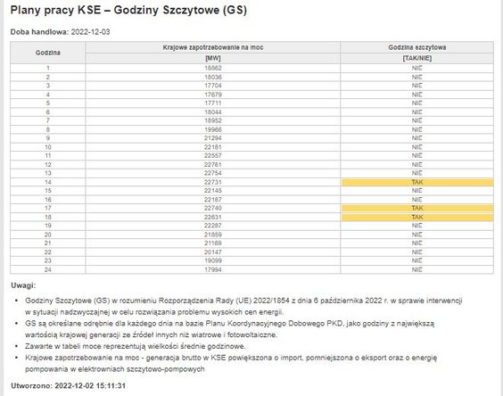 Tzw. godziny szczytu, to pora dnia kiedy wytwarzanie w elektrowniach konwencjonalnych jest największe w odpowiedzi na rosnące zapotrzebowanie na energię. Nie będzie to wiązało się z żadnymi obowiązkami, ale będzie to forma apelu czy porad, że w tych godzinach warto powstrzymać się od pracy energochłonnych urządzeń jak np. pranie czy odkurzanie. Na 3 grudnia „godziny szczytu” mają przypaść na 14:00 – 15:00, 17:00 – 18:00 oraz 18:00 – 19:00.