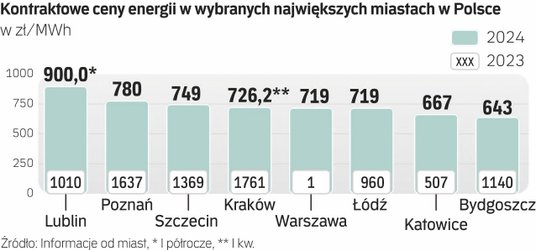 Najlepszym przykładem spadających cen kontraktowych (samorządy rozliczają się się po cenach nadal mrożonych) są dwa największe miasta w Polsce – Warszawa i Kraków, gdzie oferowana cena energii spadła (rok do roku) o odpowiednio 500 i 1000 zł. I kształtuje się ona obecnie na poziomie odpowiednio 719 i 726 zł za MWh. Oznacza to, że cena energii jest już bliska tej mrożonej, która wynosi obecnie 693 zł za MWh. Co więcej, są też miasta, gdzie energia wyceniana jest na poziomie poniżej tej ceny. Tak jest w Bydgoszczy i Katowicach, gdzie cena na ten rok wynosi odpowiednio 643 i 667 zł za MWh. Może to być też wskazówką dla rządzących, czy jest sens dalej mrozić ceny energii po 30 czerwca. Tu jednak należy pamiętać, że są jeszcze i takie miasta jak Poznań, gdzie cena energii na ten rok wynosi 780 zł MWh. Co więcej, Poznań ma już kontrakt z gwarantowaną ceną na 2025 r. W kolejnym roku miasto miałoby płacić 744 zł i to w sytuacji, w której ceny na giełdzie spadają, a inne miasta na ten rok mają już cenę niższą niż Poznań.
