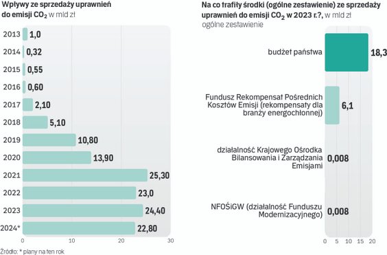W latach 2013-2023 (do 30 maja) dochody ze sprzedaży uprawnień wyniosły blisko 94 mld zł, z czego jedynie niecałe 1,3 proc. przekazano bezpośrednio na cele związane z redukcją emisji gazów cieplarnianych lub zarządzaniem tymi emisjami – po to, aby w przyszłości nie trzeba było pozwoleń kupować.