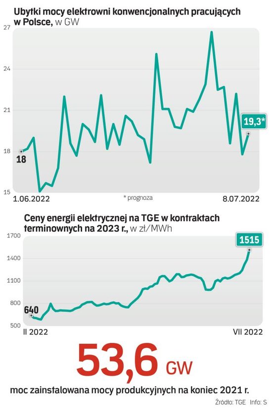 Takich cen energii na Towarowej Giełdzie Energii jeszcze nie było. W czwartek 7 lipca cena z dostawą na 2023 r. przekroczyła poziom 1500 zł zł/MWh. To m.in. efekt awarii i przestojów technicznych w elektrowniach oraz braków węgla. Te ostatnie doskwierają najbardziej. Mniejsza dostępność mocy do produkcji prądu zmniejsza rezerwę mocy będącej w dyspozycji operatora systemu przesyłowego. W efekcie 4 lipca br. system znalazł się na krawędzi kryzysu.