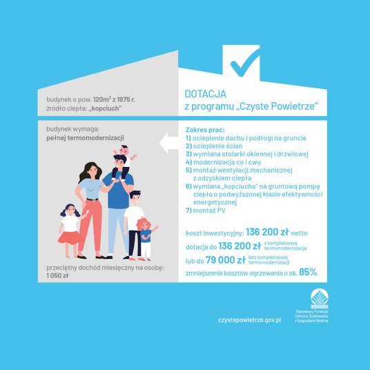 Opcja 1. obejmuje demontaż nieefektywnego źródła ciepła na paliwo stałe oraz zakup i montaż pompy ciepła typu powietrze-woda albo gruntowej pompy ciepła do celów ogrzewania lub ogrzewania i cwu.