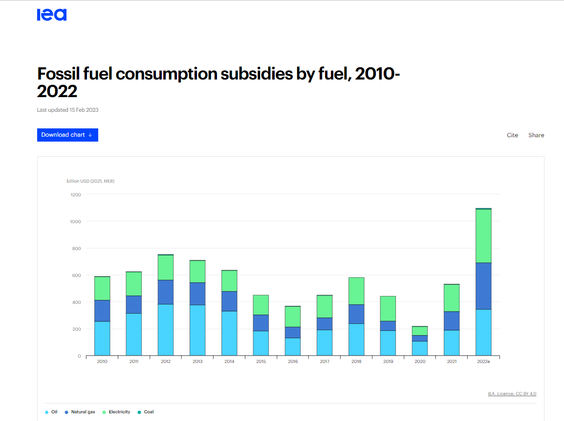 W analizie uwzględniono jedynie bezpośrednie subsydia do paliw kopalnych. Aby chronić konsumentów przed rosnącymi kosztami, rządy dalej subsydiowały zużycie ropy naftowej (ze 187 mld dol. w 2021 r. do 343 mld dol. w 2022 r.) gazu ziemnego (141 do 346 mld dol.), węgla (z 3 dol. do 9 mld dol.) i energii elektrycznej ( z 200 do 399 mld dol.). „Kiedy rządy na świecie podnoszą swoje ambicje ograniczenia paliw kopalnych w przyszłości, wydały w zeszłym roku rekordową kwotę 1 bln dolarów na subsydiowanie źródeł energii, które są głównym motorem zmian klimatycznych.” – czytamy we wnioskach raportu. Z kolei według danych Bloomberg NEF wydatki rządów w 2022 r. były ponad dwukrotnie wyższe niż całkowite globalne inwestycje w odnawialne źródła energii. Wydatki na wsparcie energetyki nastąpiły po rozmowach klimatycznych w listopadzie 2021 r., kiedy światowi przywódcy zobowiązali się do zaprzestania takich subsydiów.