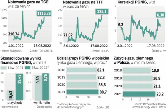 – PGNiG musi pozyskiwać dodatkowe pieniądze na kapitał obrotowy, aby móc prowadzić handel gazem ziemnym w środowisku galopujących cen tego surowca. Dla spółki nie wiąże się z tym jakieś wielkie ryzyko, gdyż nie utrzymuje ona otwartej pozycji i nie bierze ryzyka zmian cen – uważa Kliszcz. Dodaje, że co do zasady grupa nie traci na rosnących cenach gazu, ponieważ w kolejnym ruchu przenosi je na klientów. W przypadku gospodarstw domowych i innych odbiorców, którym sprzedaje błękitne paliwo zgodnie z bardzo niską taryfą, otrzymuje z kolei rekompensatę od Skarbu Państwa. – Wykazane w II kw. 3,4 mld zł straty EBITDA w biznesie obrotu i magazynowania to efekt rozliczeń prowadzonych w grupie pomiędzy segmentami wydobycia i obrotu. Na poziomie całego koncernu spółka korzysta na rosnących cenach gazu – mówi analityk BM mBanku.