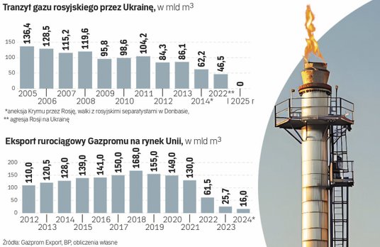 – Kiedy ponad 25 lat temu Putin obejmował władzę w Rosji, roczny transport gazu przez terytorium Ukrainy do Europy wynosił ponad 130 miliardów metrów sześciennych. Dziś tranzyt rosyjskiego gazu wynosi zero. To jedna z największych porażek Moskwy – podkreślił Zełenski. Podobnie jak wielu ekspertów, także prezydent Ukrainy jest zdania, że to Kreml sam ją sobie zgotował. Przekształcanie surowców energetycznych w broń i cyniczny szantaż energetyczny długoletnich klientów jest tym, co pozbawiło Rosję najbardziej zyskownego i dostępnego geograficznie rynku – dodał prezydent Ukrainy.