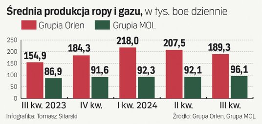 Pozytywny wpływ rosnących cen gazu powinien być widoczny w wynikach Orlenu pomimo nieznacznie spadającego w ubiegłym roku wydobycia. Z ostatnich danych wiadomo, że w III kwartale wyniosło ono 189,3 tys. boe (baryłki ekwiwalentu ropy) dziennie, podczas gdy w II kwartale 207,5 tys. boe, a w I kwartale rekordowe 218 tys. boe. Koncern około połowy wszystkich węglowodorów wydobywa w Norwegii. Kolejnym istotnym obszarem, na którym operuje jest Polska (37 proc. łącznego wydobycia). Znacznie mniej surowców pozyskuje już kolejno w Kanadzie, Pakistanie i na Litwie. Orlen, biorąc pod uwagę obecne ceny ropy i gazu, ma korzystną strukturę ich wydobycia. Ostatnio prawie trzy czwarte z ogółem wydobywanych węglowodorów stanowiło błękitne paliwo.