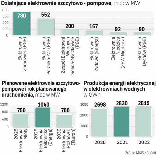 W Polsce działa już sześć elektrowni szczytowo-pompowych o łącznej mocy 1,9 GW. Największe spółki energetyczne mają nowe projekty o łącznej mocy ok. 2,5 GW. PGE planuje budowę takiej instalacji w Młotach (750 MW), Energa – w Tolkmicku (1040 MW), a Tauron – w Rożnowie (700 MW). Wszystkie te projekty są na wstępnym etapie realizacji.