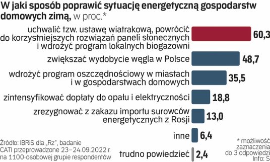 W szczycie kryzysu związanego z brakiem węgla i gigantycznymi cenami prądu ponad 60 proc. Polaków chce, by rząd pilnie uchwalił ustawę liberalizującą rozwój farm wiatrowych, powrócił do korzystniejszych rozwiązań dotyczących paneli słonecznych i wdrożył program lokalnych biogazowni – wynika z sondażu IBRiS dla „Rzeczpospolitej”, w którym pytaliśmy, jak poprawić sytuację energetyczną gospodarstw domowych zimą.