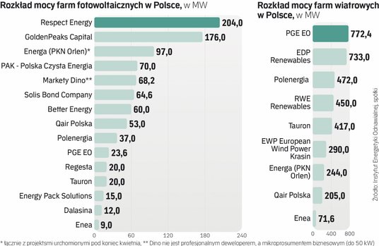 Inne państwowe koncerny energetyczne dopiero gonią peleton: w tym roku rozpoczynają budowę projektów fotowoltaicznych o mocy ponad 250 MW. Najbardziej zaawansowane plany poza Orlenem (właściciel Energi) ma Polska Grupa Energetyczna. O ile Energa ma dziś 97 MW mocy w fotowoltaice, a do końca tego roku, po zrealizowaniu kolejnych inwestycji, będzie dysponować ok. 110 MW, to Grupa PGE posiada obecnie 24 farmy fotowoltaiczne o mocy zainstalowanej ponad 22 MW.
