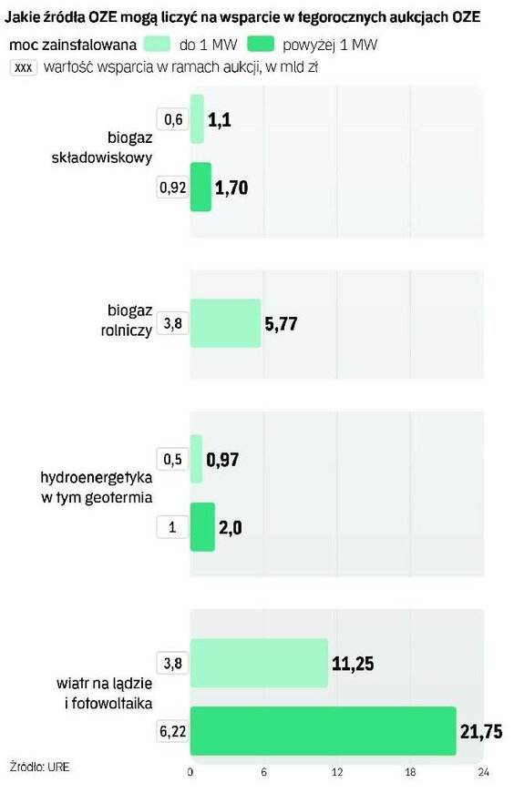 Jak poinformował Urząd Regulacji Energetyki, tegoroczne aukcje sprzedaży energii elektrycznej ze źródeł odnawialnych rozpoczną się w poniedziałek, 9 grudnia, i zakończą we wtorek, 17 grudnia. Najbardziej interesujące będą dwie ostatnie, przeznaczone dla dotychczas najbardziej popularnych technologii – tj. fotowoltaiki i lądowych instalacji wiatrowych. Zostaną przeprowadzone w dwóch koszykach dla wybranych technologii (o mocy zainstalowanej elektrycznej nie większej niż 1 MW i powyżej 1 MW) 16 i 17 grudnia. Dla mniejszych instalacji przewidziano kwotę 3,82 mld zł, zaś dla dużych instalacji 6,22 mld zł. To właśnie w tym największym koszyku w ramach aukcji może zostać rozdysponowane najwięcej, bo 21,7 TWh, energii spośród 44,6 TWh oferowanych łącznie we wszystkich koszykach. Od czasu kryzysu energetycznego i wzrostu cen aukcje OZE traciły na popularności. Ten trend powoli się odwraca.