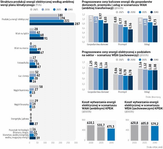 – Głównym czynnikiem determinującym prognozowany spadek cen w przypadku scenariusza WAM (ambitny scenariusz KPEiK) są prognozowane redukcje uśrednionych kosztów wytwarzania w systemie, osiągnięte głównie za sprawą szybkiego zwiększania udziału OZE w miksie energetycznym oraz zwiększania się udziału odbiorców działających w ramach lokalnych spółdzielni energetycznych. Natomiast w przypadku scenariusza WEM (scenariusz zachowawczy KPEiK) głównym czynnikiem determinującym prognozowany wzrost cen są rosnące w czasie koszty zakupu uprawnień do emisji gazów cieplarnianych. Z uzyskanych informacji w MKIŚ wynika, że w scenariuszu WAM (ambitnej transformacji) ceny końcowe energii dla gospodarstw domowych za MWh wyniosą 1 124 zł w 2030 r., 969 zł w 2035 r. i 827 zł w 2040 r. Z kolei ceny końcowe energii dla przemysłu za MWh wyniosą 772 zł w 2030 r., 663 zł w 2035 r. i 564 zł w 2040 r. Wreszcie ceny końcowe energii dla usług w 2030 r. za MWh wyniosą 1 034 zł, 874 zł w 2035 r. i 732 zł w 2040 r.