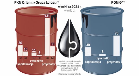 – Koncern może osiągać przychody 400 mld zł. Zbudowaliśmy 155. koncern na świecie – mówi Obajtek. Jak wynika z danych, już teraz Grupa Orlen – po wchłonięciu PGNiG i Lotosu – jest trzecią co do wielkości grupą rafineryjną w Europie z możliwościami przerobowymi rzędu ponad 40 mln ton. Spółka może jednak stracić tę pozycję na rzecz firm Shell i BP, po tym jak część rafinerii w Gdańsku przejmie – w efekcie realizacji zaleconych przez UE środków zaradczych – Saudi Aramco.