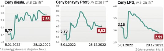 – W związku ze składanymi ostatnio deklaracjami przez przedstawicieli rządu i prezesa Orlenu myślę, że od nowego roku nie zaobserwujemy drastycznych podwyżek cen paliw na krajowych stacjach. Prawdopodobnie średni poziom cen będzie co najwyżej o kilka groszy wyższy lub niższy od tego, co dziś obserwujemy – mówi Jakub Bogucki, analityk rynku paliw z e-petrol.pl. To może oznaczać, że kierowcy będą płacić około 7,66 zł za litr diesla, 6,53 zł za benzynę Pb95 oraz 2,9 zł za autogaz.