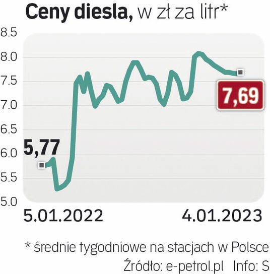 Z najnowszych danych e-petrol.pl wynika, że w tym roku kierowcy płacą na stacjach średnio po 7,69 zł za litr oleju napędowego, czyli zaledwie o 3 gr więcej niż na koniec ubiegłego roku. Minimalna zmiana nastąpiła pomimo istotnych zwyżek stawek VAT, opłaty paliwowej i akcyzy. Obecna sytuacja może mieć jednak charakter krótkotrwały ze względu na mocno ograniczoną dostępność tego paliwa. – Obecnie podaż diesla na polskim rynku jest na tyle mała, że nie wykluczam wzrostu jego cen detalicznych w I kwartale, nawet do 10 zł za litr. Dużo jednak zależy od czynników zewnętrznych – uważa Andrzej Sikora, prezes Instytutu Studiów Energetycznych.