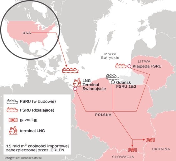 Polska była lepiej przygotowana niż wiele innych państw regionu na ten wstrząs. Dysponowała już terminalem LNG w Świnoujściu, który umożliwiał odbiór ładunków z odległych kierunków, w tym ze Stanów Zjednoczonych, Kataru i Afryki. Równolegle finalizowano budowę podmorskiego gazociągu Baltic Pipe, łączącego złoża na Norweskim Szelfie Kontynentalnym z polskim systemem przesyłowym. Gazociąg został uruchomiony jesienią 2022 roku.