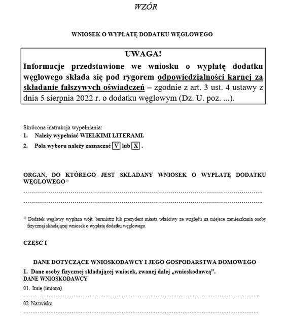 Taki sam okres czasu na złożenie uwag mają także inne ministerstwa i urzędy centralne. Resort klimatu i środowiska, zgodnie z ustawą z 5 sierpnia 2022 r. o dodatku węglowym przygotowało wzór wniosku o jego wypłatę. Dodatek przysługuje osobie w gospodarstwie domowym, w przypadku, gdy głównym źródłem ogrzewania gospodarstwa domowego jest kocioł na paliwo stałe, kominek, koza, ogrzewacz powietrza, trzon kuchenny, piecokuchnia, kuchnia węglowa lub piec kaflowy na paliwo stałe, zasilane paliwami stałymi, wpisane lub zgłoszone do centralnej ewidencji emisyjności budynków.
