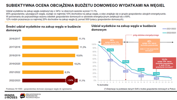 Wraz ze wzrostem wydatków na węgiel wzrósł także udział tych wydatków w budżetach domowych i w obecnym sezonie grzewczym wyniósł on 11,1 proc. wobec 8,3 proc. w poprzednim sezonie grzewczym. „Co ciekawe, pomimo wzrostów wydatków na węgiel, wzrosła jednocześnie ogólna liczba gospodarstw wykorzystujących węgiel do ogrzewania. W obecnym sezonie grzewczym jest to 32 proc. wszystkich gospodarstw w Polsce, wobec 27 proc. w poprzednim sezonie.” – informuje Izba.