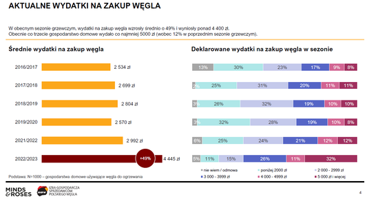 Podstawowy wniosek, który płynie z badania wskazuje, że wydatki na zakup węgla wzrosły (względem sezonu grzewczego 2021/2022) średnio o 49 proc. i wyniosły ponad 4 400 zł. Najwięcej, bo 32 proc. gospodarstw domowych, na zakup węgla wydało więcej niż 5000zł. Z kolie 11 proc. gospodarstw wydało pomiędzy 4000 zł a 4999 zł, 26 proc. gospodarstw wydało od 3000 zł do 3999 zł, 15 proc. gospodarstw wydało od 2000 zł do 2999 zł, 11 proc. gospodarstw wydało poniżej 2000 zł na zakup węgla, 5 proc. gospodarstw odmówiło udzielenia odpowiedzi lub odpowiedziało „nie wiem”.