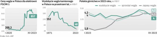 Jak wynika z danych Agencji Rozwoju Przemysłu, wydobycie węgla kamiennego w Polsce wyniosło w grudniu ub.r. 4 mln ton w porównaniu z 4,64 mln ton miesiąc wcześniej i 4,41 mln ton w grudniu 2022 r. Zliczając wszystkie miesiące, daje to ledwie 48 mln ton. Tak niewiele jeszcze nigdy nie było. Od tej liczby trzeba jeszcze odjąć ok. 14 mln ton węgla koksującego na potrzeby sektora hutniczego z Jastrzębskiej Spółki Węglowej. W 2023 r. kopalnie Polskiej Grupy Górniczej (PGG) dostarczyły ok. 21 mln ton węgla, czyli o 1,5 mln mniej niż rok wcześniej. Zaś w tym roku wydobycie ma spaść do ok. 20 mln ton. Lubelska Bogdanka wydobyła ponad 7 mln ton, Południowy Koncern Węglowy (dawniej Tauron Wydobycie) – 5 mln ton, Węglokoks Kraj kopalnia Bobrek – Piekary – 1,2 mln oraz prywatna PG Silesia należąca do Bumechu – ok. 1–1,2 mln ton. Ostatnie analizy resortu klimatu i środowiska ujęte w projekcie aktualizacji Polityki Energetycznej Polski do 2040 r. wskazują, że za sześć lat wydobycie węgla wyniesie ok. 21 mln ton. Ostatnia kopalnia ma zostać zamknięta w 2049 r., ale przy spadkach, jakie mamy, może to być początek lat 40.